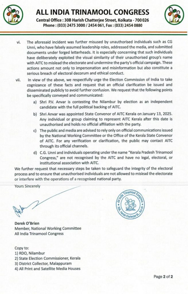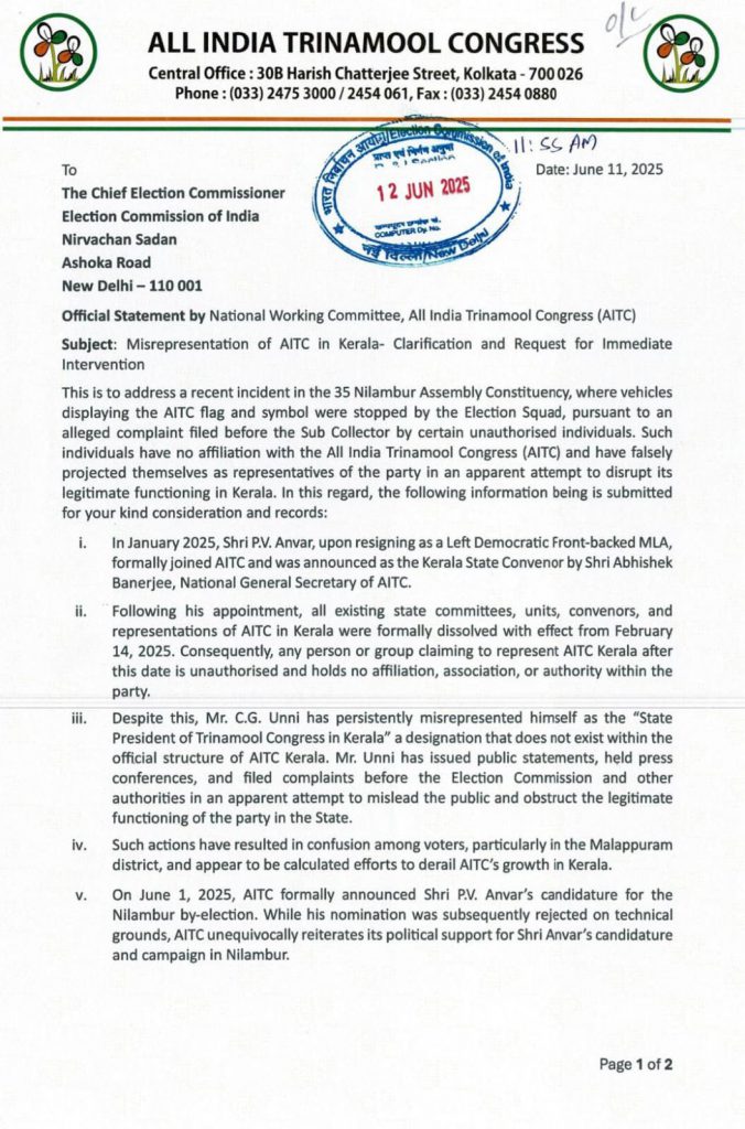 We unequivocally condemn the unauthorised and fraudulent use of our name, symbol, and identity during the Nilambur by-election. Shri P.V. Anvar is the sole authorised State Convenor for Kerala