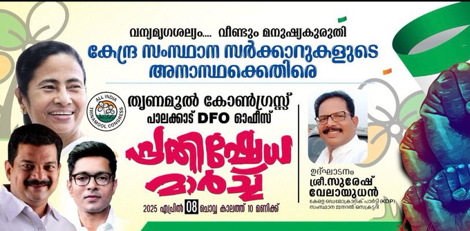 In protest against the negligence of the Central and State governments and for the safety of people’s lives, the All India Trinamool Congress Palakkad District Committee will organize a protest march in front of the DFO office on Tuesday, April 8, 2025, at 10 a.m.
